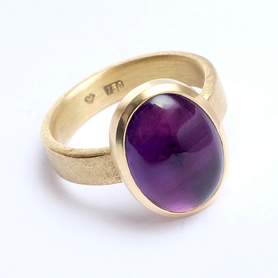 Der feine Goldton harmoniert perfekt mit dem kräftigen Violett eines ovalen Amethyst-Cabochons. Ein Ring zum Verlieben. Au750